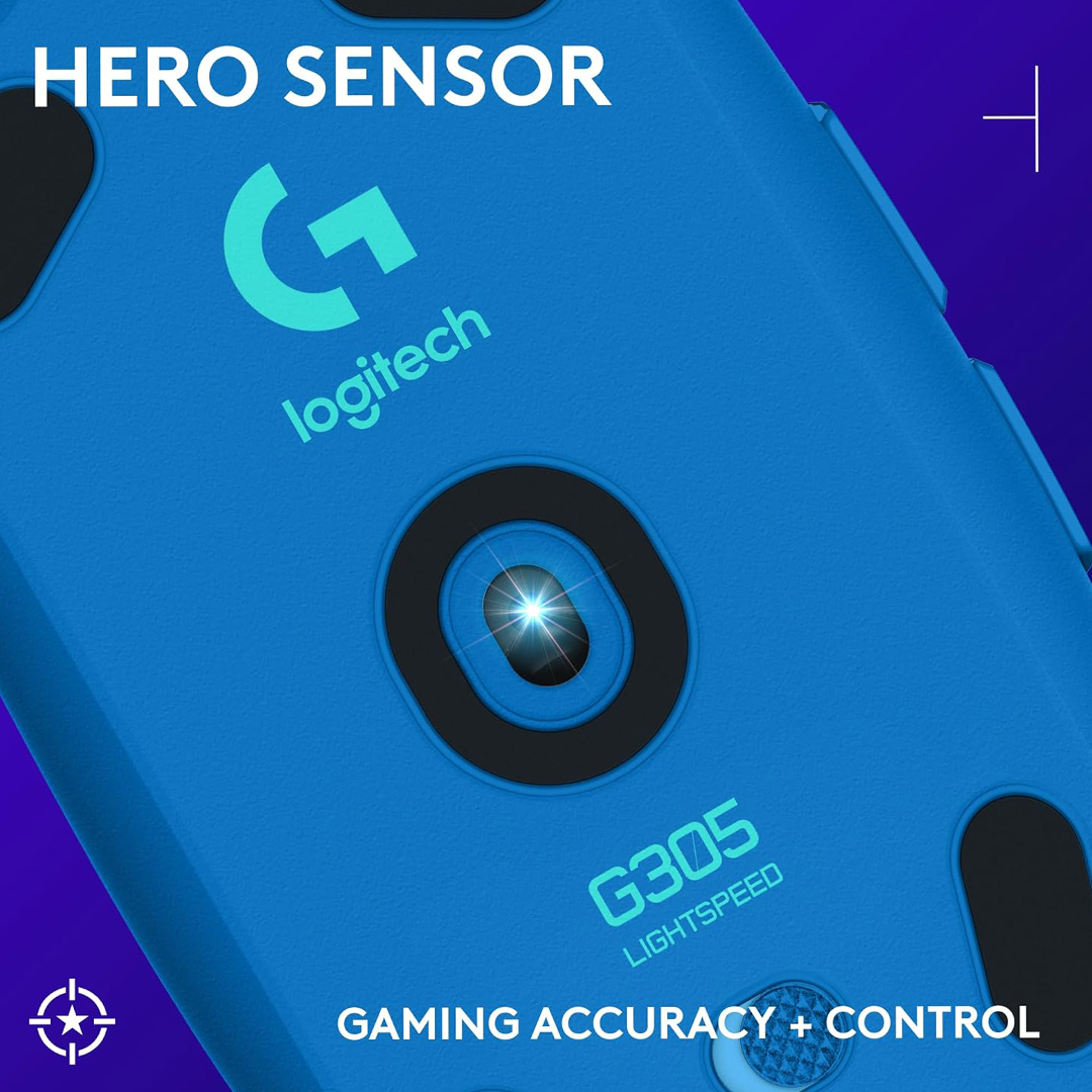 Step up your gaming with the Logitech G305 Wireless Gaming Mouse. Powered by the HERO 12K sensor, it delivers precise tracking and exceptional responsiveness up to 12,000 DPI. LIGHTSPEED Wireless technology provides a lag-free experience with a 1ms report rate, giving you competition-level performance. Lightweight at just 99 grams, this mouse is easy to maneuver and ideal for fast-paced gameplay. With six programmable buttons, on-board memory, and a compact design with built-in USB receiver storage, the G305 offers convenience and customization for both PC and Mac. Enjoy up to 250 hours of continuous play on a single AA battery.